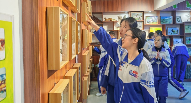 “接下來(lái)我們看到的是蝶類和蛾類,他們需要經(jīng)歷卵、幼蟲(chóng)、蛹、成蟲(chóng)四個(gè)階段?!痹陂L(zhǎng)白山生物標(biāo)本室,講解員向?qū)W生們介紹了標(biāo)本室的歷史,昆蟲(chóng)種類和數(shù)目、標(biāo)本的采集地等相關(guān)知識(shí)。學(xué)生們通過(guò)零距離的接觸,被種類繁多、栩栩如生的各式標(biāo)本深深吸引。